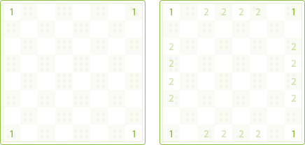 The more stones on the board the harder the game. Each wrong move can lead to your defeat, you must analyse every step you make. Your strategy must be to occupy the corner positions (1) and the perimeter of board (2). If you surrender these positions to your opponent, your chances to win are getting slimmer!